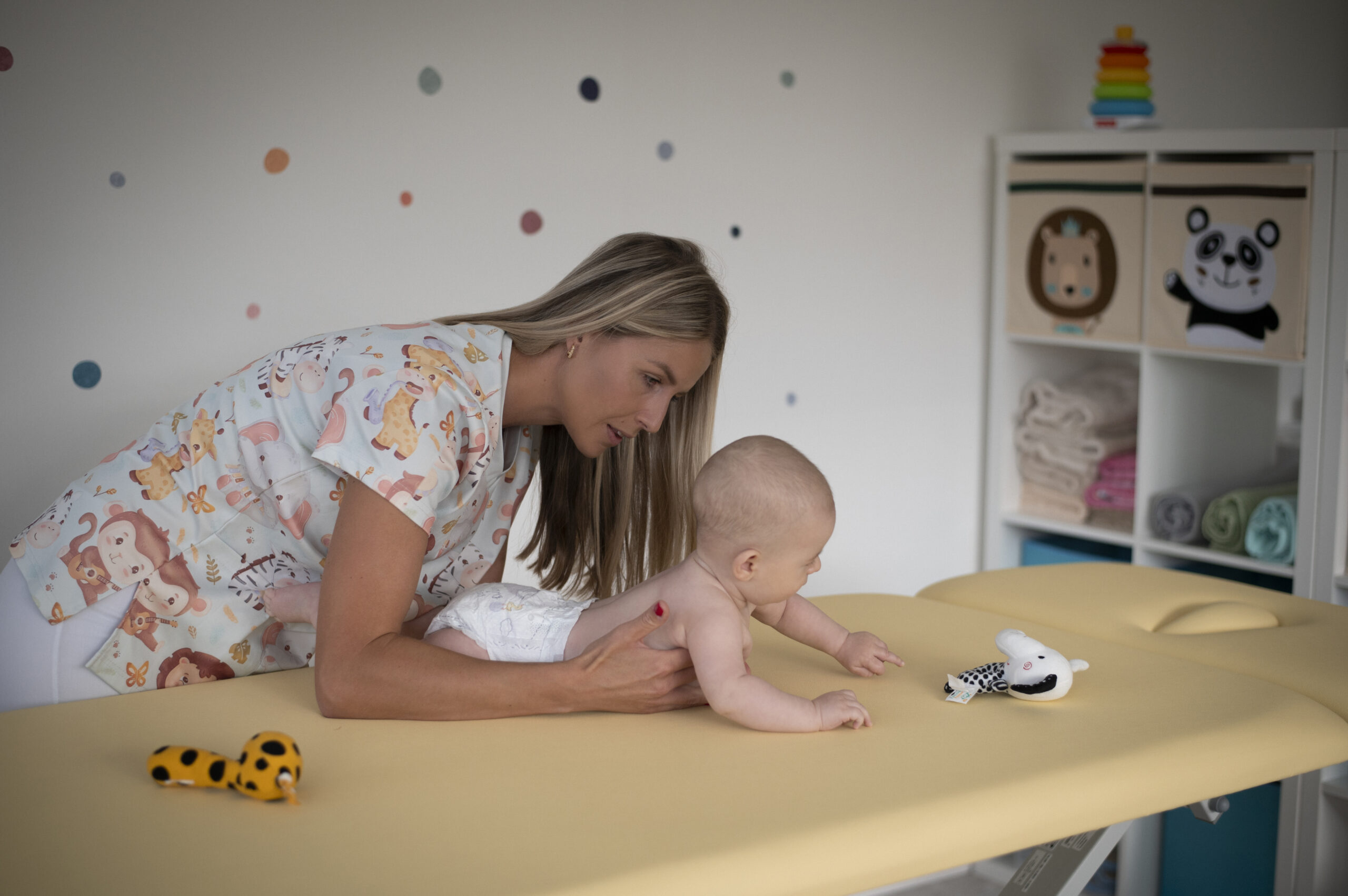 Fyzioterapia dojčiat je zameraná na včasnú identifikáciu odchýlok v psychomotorickom vývine a na nastavenie cielenej terapeutickej intervencie. Využíva najmodernejšie poznatky z neurovývinovej diagnostiky a vychádza z princípov neurofyziologických konceptov ako sú Vojtova metóda, handling či koncept senzomotorickej integrácie. Indikácie k vyšetreniu a terapii: preferenčné držanie hlavy na jednu stranu (predilekcia), plagiocefália (asymetrické zploštenie lebky), nápadná svalová hypotónia alebo hypertonia, asymetrické pohybové prejavy, oneskorenie alebo vynechanie vývojových míľnikov (otáčanie, opora, lozenie…), perinatálne rizikové faktory (predčasný pôrod, hypoxicko-ischemická encefalopatia, nízka pôrodná hmotnosť), diagnostikované neuromotorické poruchy.